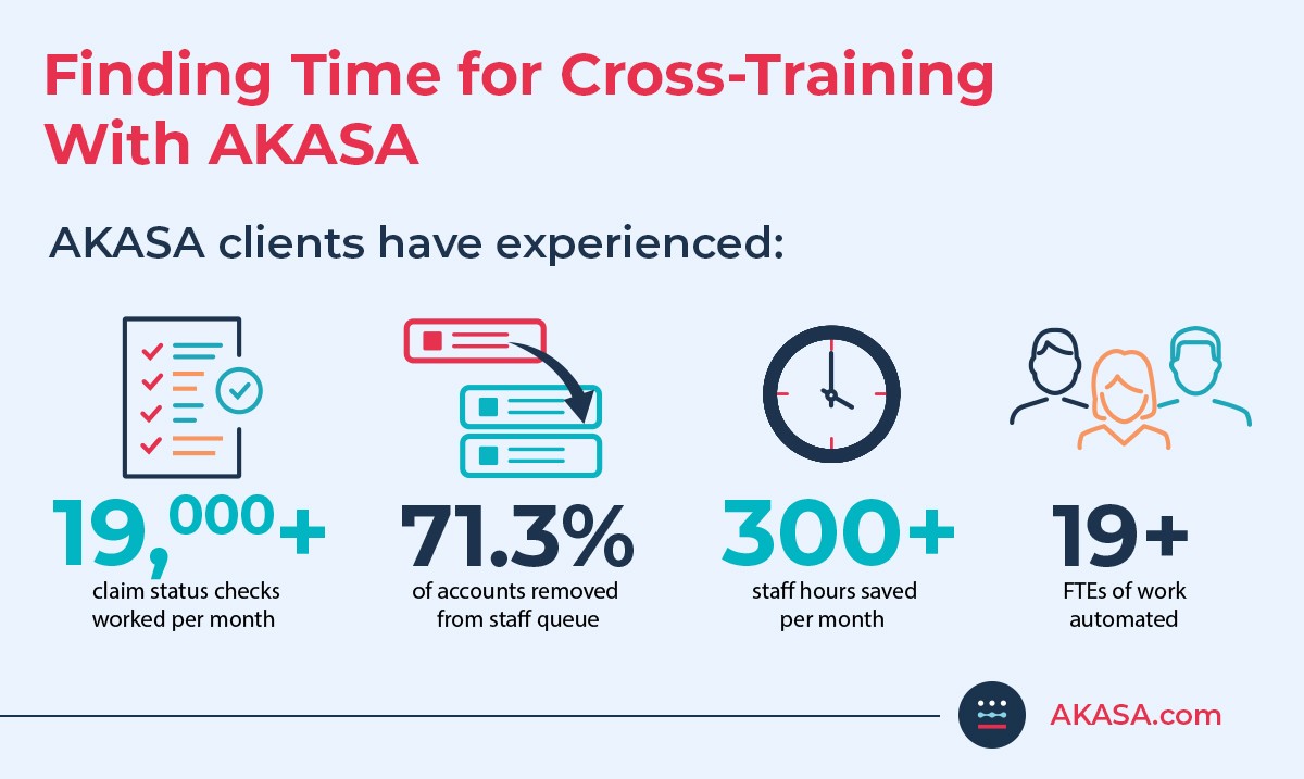 Cross-training is a big undertaking, especially with how nuanced and in-depth the revenue cycle is. It costs a resource you likely have little of to spare -- time. Powerful healthcare AI can take care of repetitive tasks, like claim status checks and prior authorization. Offloading manual, repetitive, and time-consuming tasks from your team allows them to cross-train on more complex, high-value, and meaningful work, like complex denials and improving the patient experience. Not to mention, RCM automation can significantly improve revenue outcomes. Cross-training, paired with the right healthcare AI, can help you improve employee engagement, satisfaction, and retention by re-adjusting workloads, reducing burnout, allowing staff to work at the top of their skill set, and empowering your team to do the work they love. Read more about how streamlining RCM with technology drives employee engagement. The AKASA platform combines generative AI (GenAI) and large language models (LLMs) with a dedicated team of revenue cycle experts. This allows us to deliver resilient, end-to-end healthcare RCM AI capable of growing with your workflows and staff.
