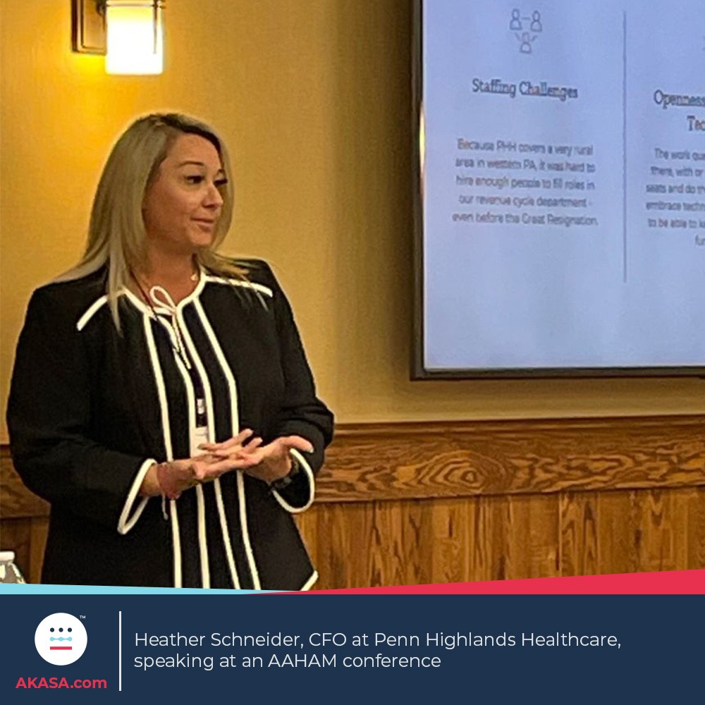 Penn Highlands Healthcare (PHH) is a rural provider with eight hospitals, serving the people of 26 counties across Northwestern/Central and Southwestern Pennsylvania and bringing in roughly $850M NPR. Like the rest of the industry, staffing challenges are nothing new to them. But, in light of the coronavirus pandemic, PHH found themselves facing an even greater challenge: Their staff numbers were dwindling, while healthcare demands were rapidly increasing. Heather Schneider, CFO at PHH, and Wynne Campbell, director of customer engagements at AKASA, recently spoke at the Three Rivers AAHAM Fall Conference. Schneider discussed the struggles PHH faced and how automation helped improve their operations -- but also changed how they worked moving forward.