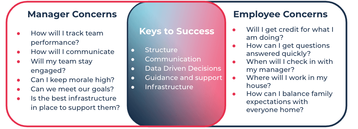 Expect productivity to decline, at least in the beginning, while team members adapt to a new work setting. Identify and clearly communicate acceptable thresholds and what will be done to mitigate performance and productivity concerns. Encourage managers to be direct about productivity, quality, and any other concerns — be ready to talk about it and be ready to offer guidance.