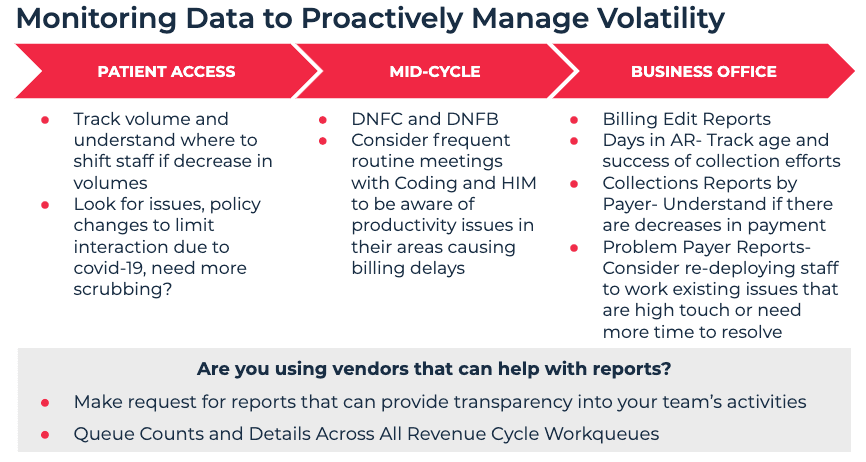 Understand how volume changes and policy changes in Patient Access could impact your workload. In the mid cycle, consider holding frequent routine meetings with coding and medical records to stay aware of productivity issues in their areas that may result in billing delays. In the business office, might you expect an increased need for billing edit reports? Days in AR will be as critical as ever. How might you expect your age and success of collection efforts to shift? Proactively communicate those expected changes with management and your team.