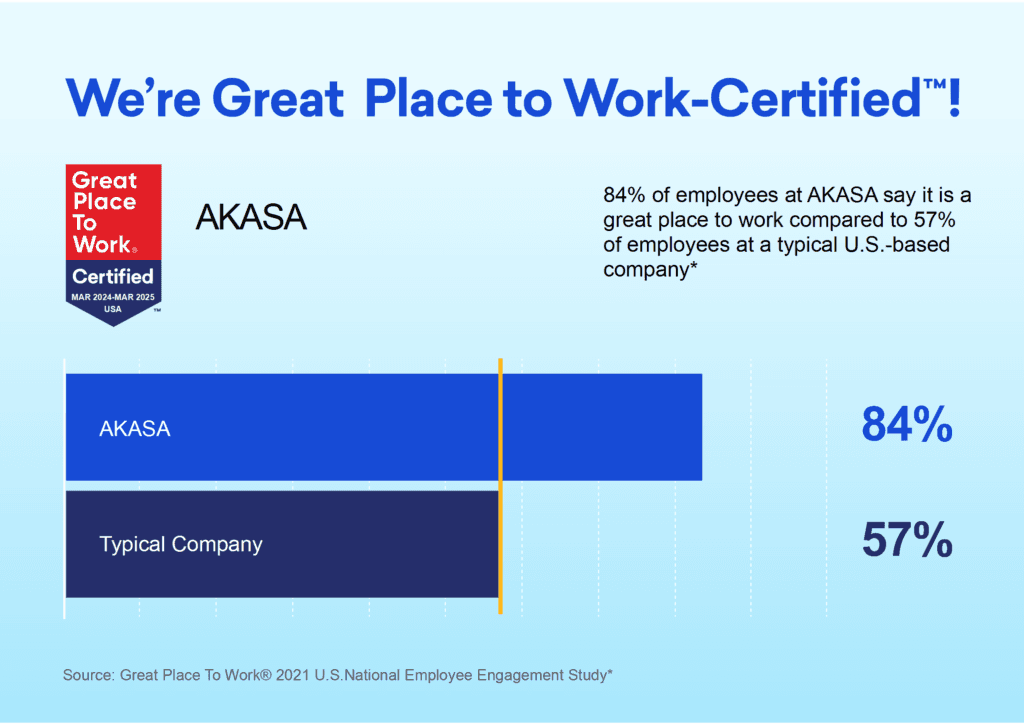 The prestigious award is based entirely on what current employees say about their experience working at AKASA. This year, 84% of employees said it’s a great place to work — compared to 57% of employees at a typical U.S.-based company.