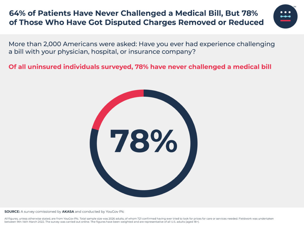 Of all uninsured individuals surveyed, 78% have never challenged a medical bill