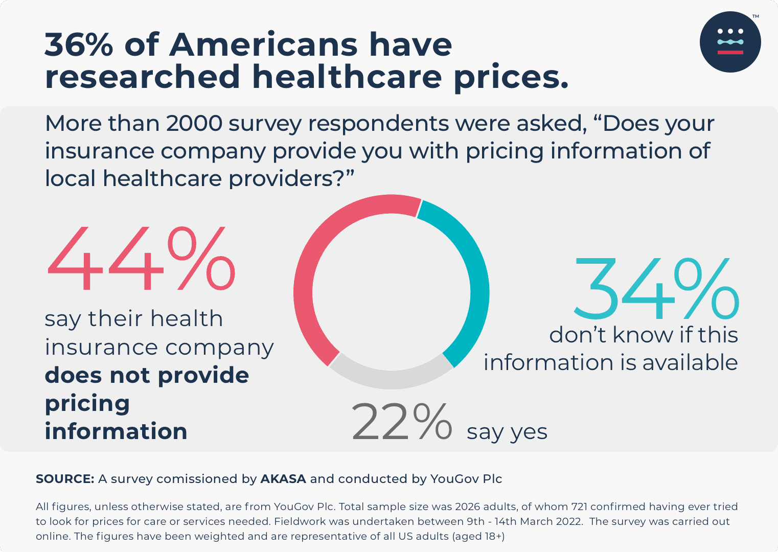 The YouGov survey, commissioned by AKASA, fielded responses from 2,026 Americans between March 9–14, 2022. The online survey was conducted at a confidence level of 95% and results for the total sample have a margin of error of +/- 2.18%, while results among those who have sought prices for healthcare services have a margin of error of +/-3.65%. The figures have been weighted and are representative of all US adults 18 and older.