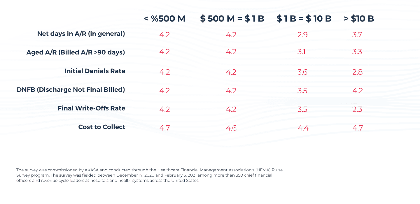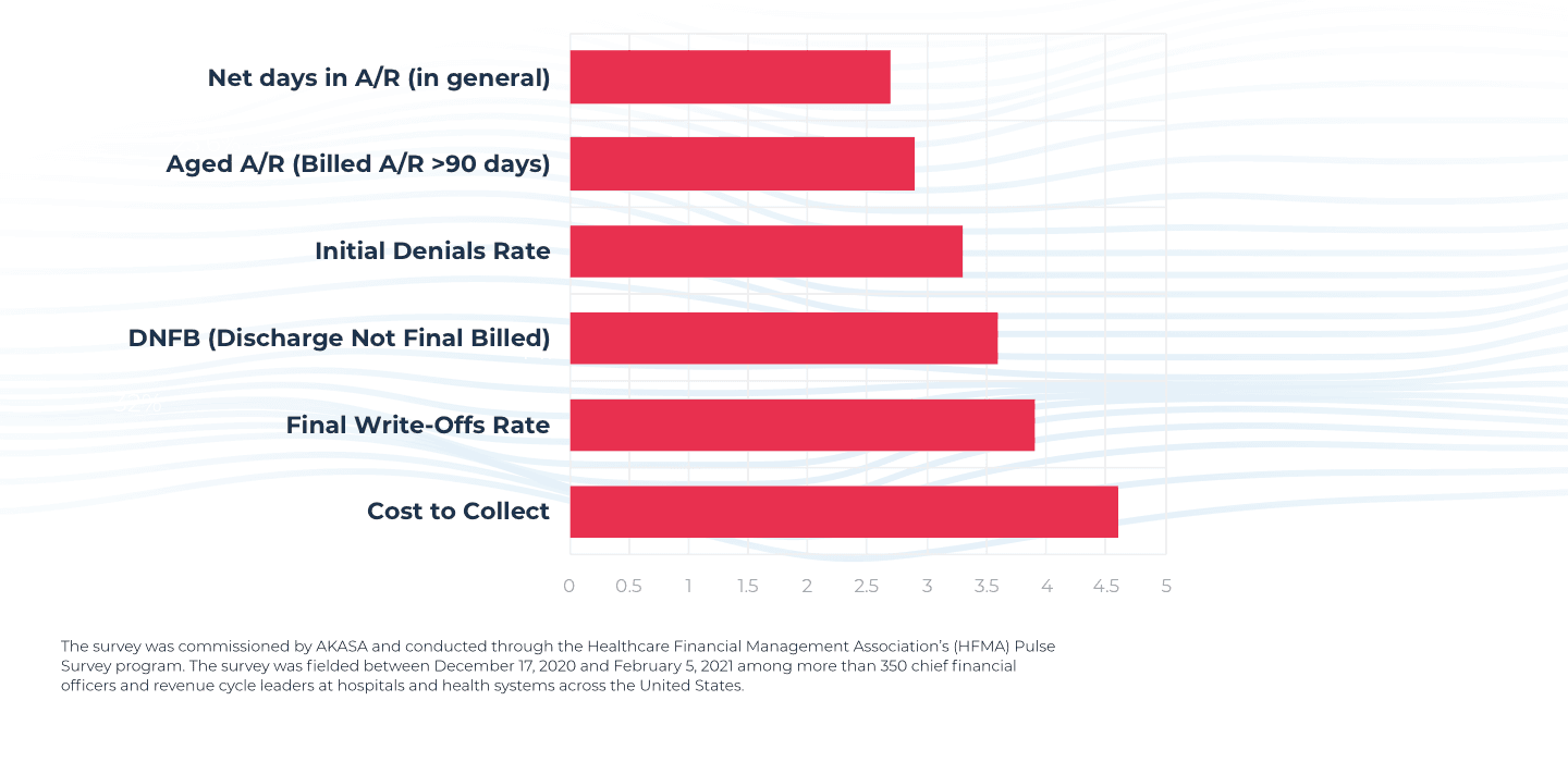 South San Francisco, Calif., July 15, 2021 — AKASA™, the only Unified Automation™ company for healthcare revenue cycle management, today released survey results highlighting how top key performance indicators have evolved in healthcare revenue cycle operations. Benchmarks such as the number of days a claim lingers in accounts receivable, the number of outstanding unpaid patients bills 90+ days past due, and initial denial rate have emerged as the top key performance indicators.
