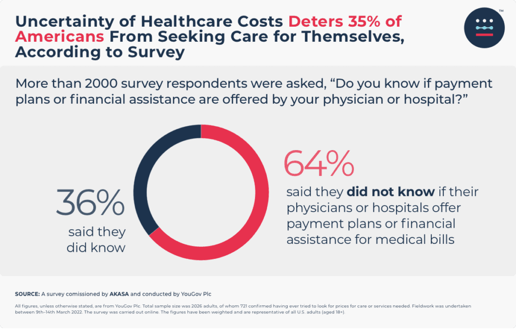 South San Francisco, Calif. - October 27, 2022 - AKASA™, the leading developer of AI for healthcare operations, released findings from a new survey conducted on its behalf by YouGov, which highlights how limited price transparency in healthcare can influence patient decisions on whether to seek necessary care and how the lack of awareness about financial resources offered by health systems puts patients at a disadvantage when managing medical bills.