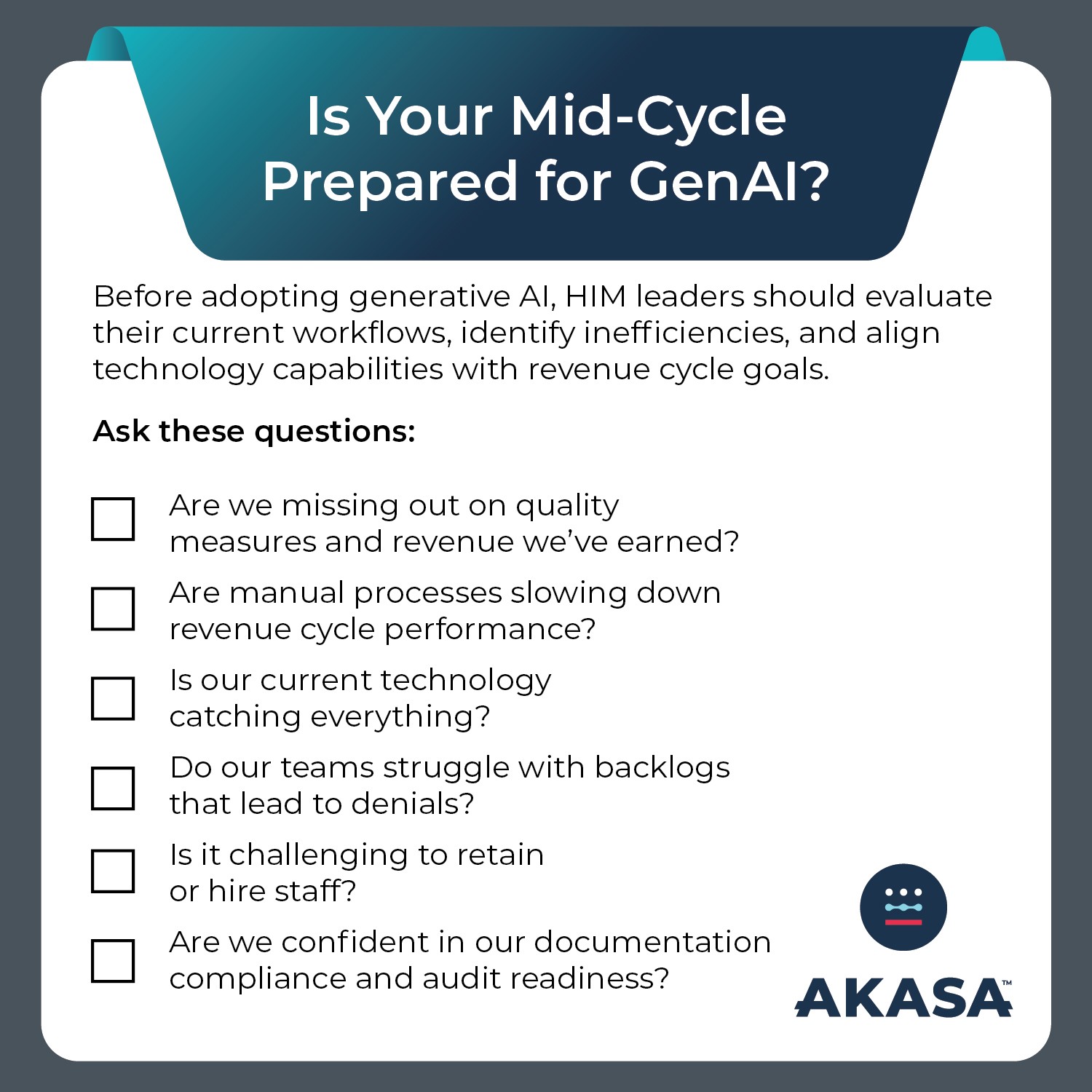 Use this checklist to uncover gaps in your mid-revenue cycle operations that generative AI can help solve. By checking off these common challenges, you’ll see where GenAI can boost efficiency, reduce denials, and strengthen documentation and compliance.