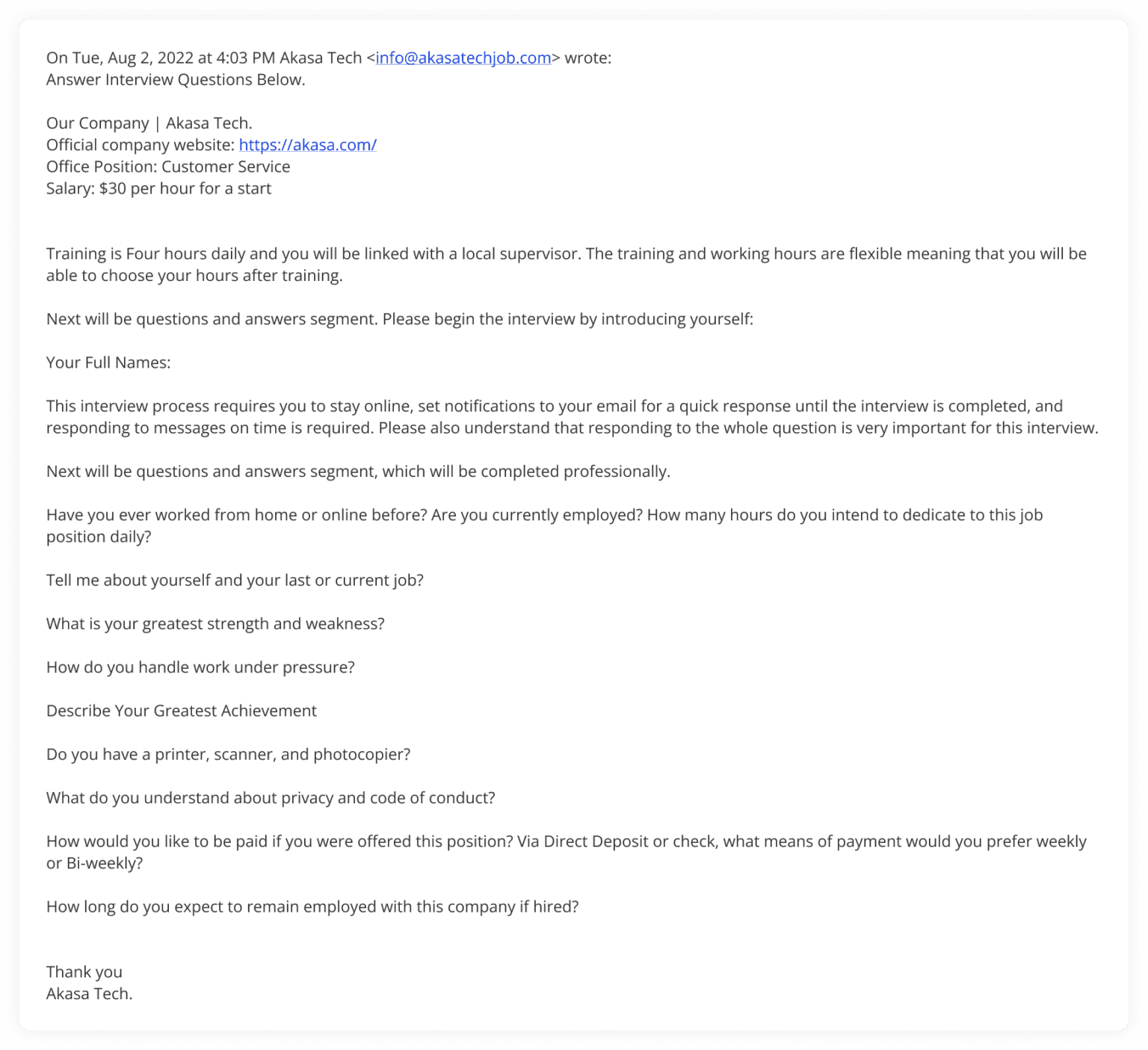 The sender’s email is @akasatechjob.com, not @stageakasa.wpengine.com