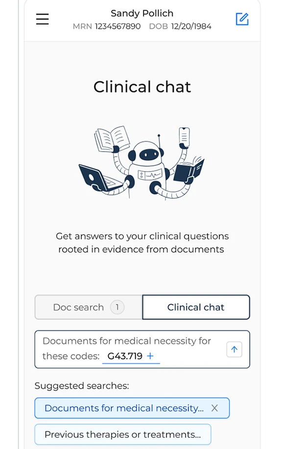 This clinical documentation partner is built for non-clinical staff and designed to reduce EHR digging and speed up decisions. It’s an easy-to-use application that’s embedded right into your workflow. Surface key documentation, summarize records, and support decisions — without sifting through charts.